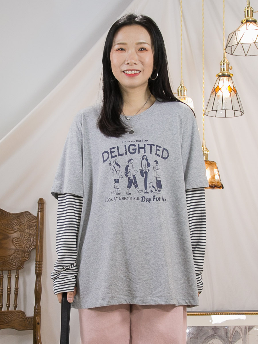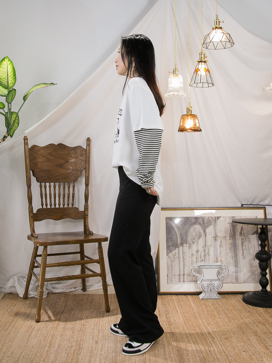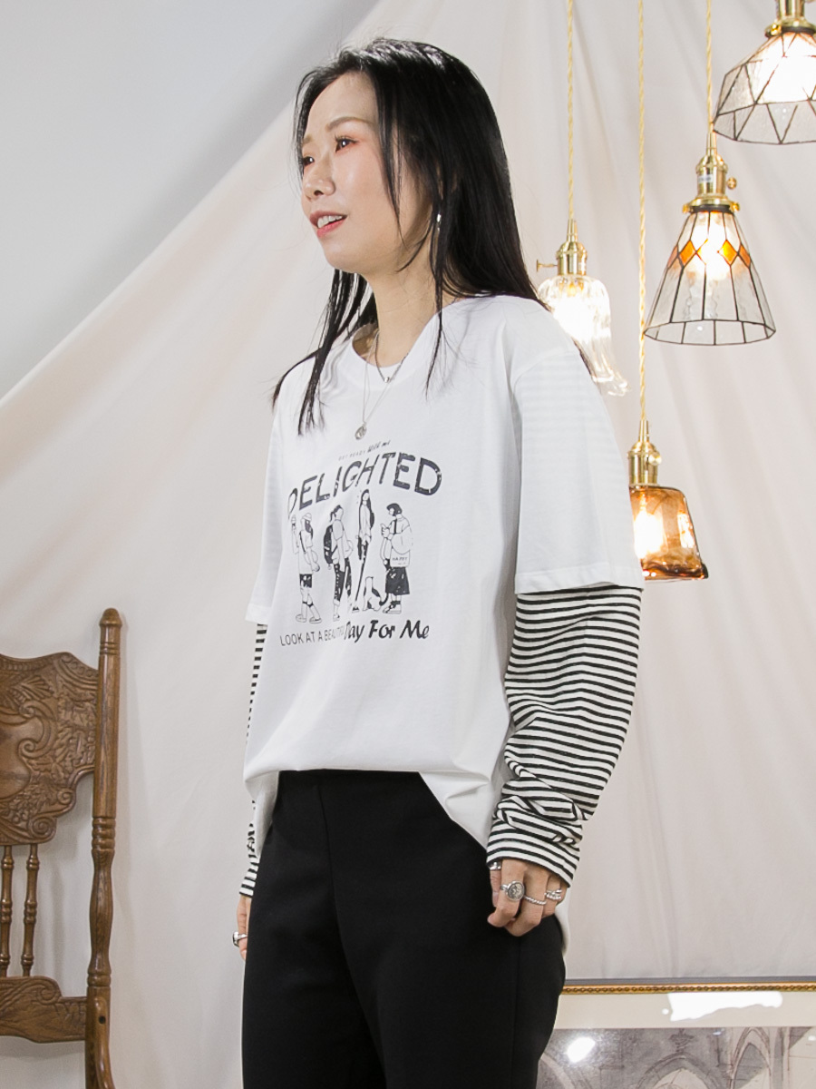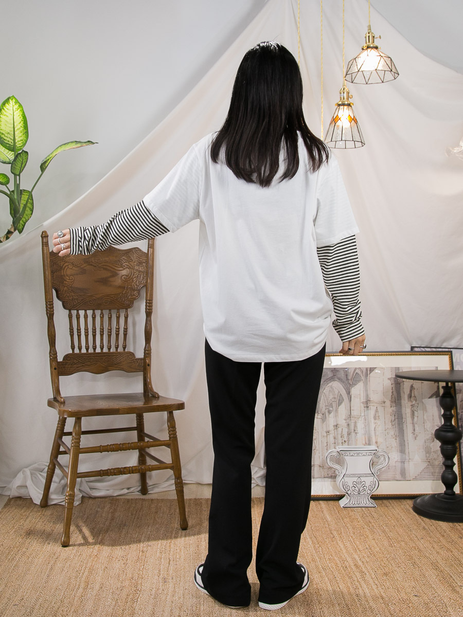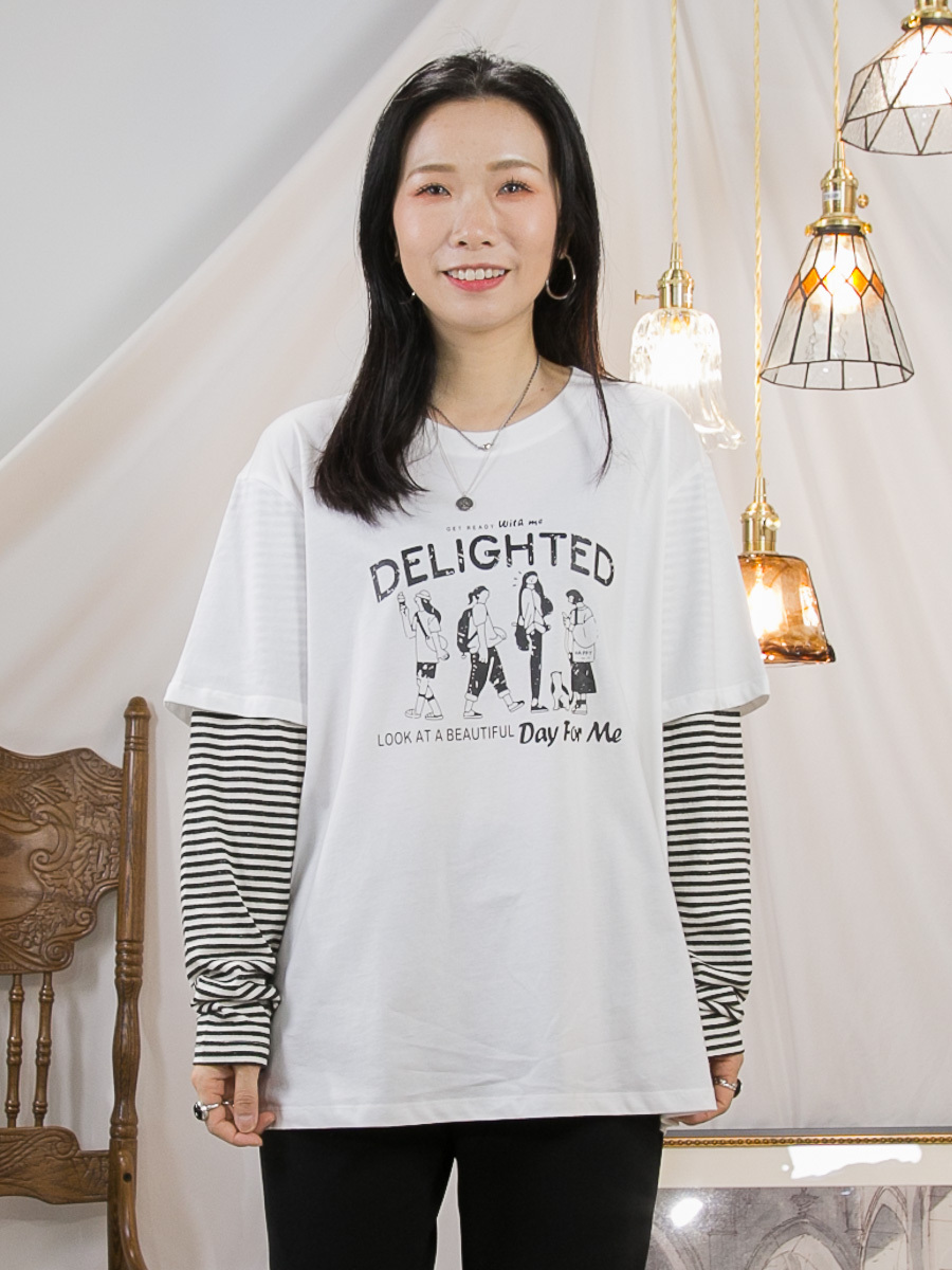 英文字PRINT.手袖橫間 拼 淨色 COTTON料TOP