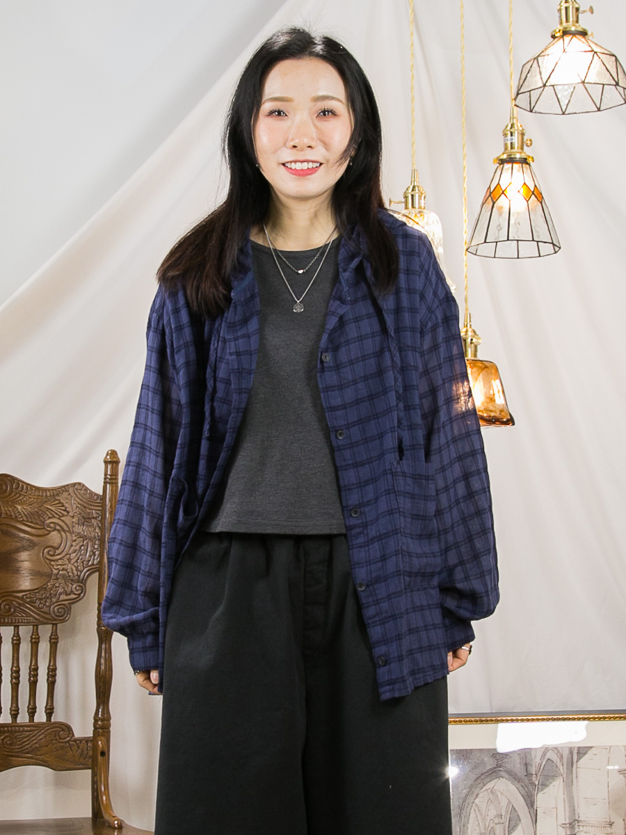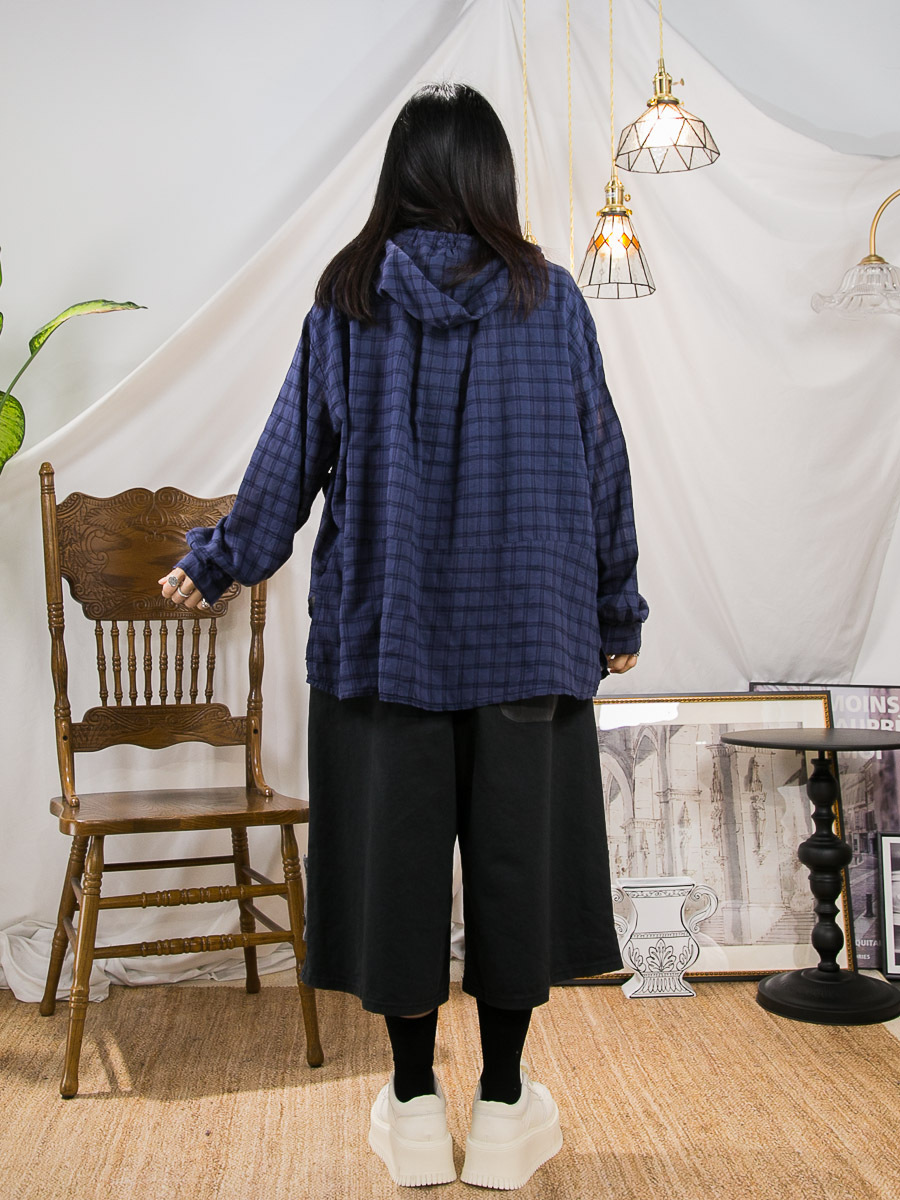 全開胸扣鈕.有帽.格仔麻棉料TOP